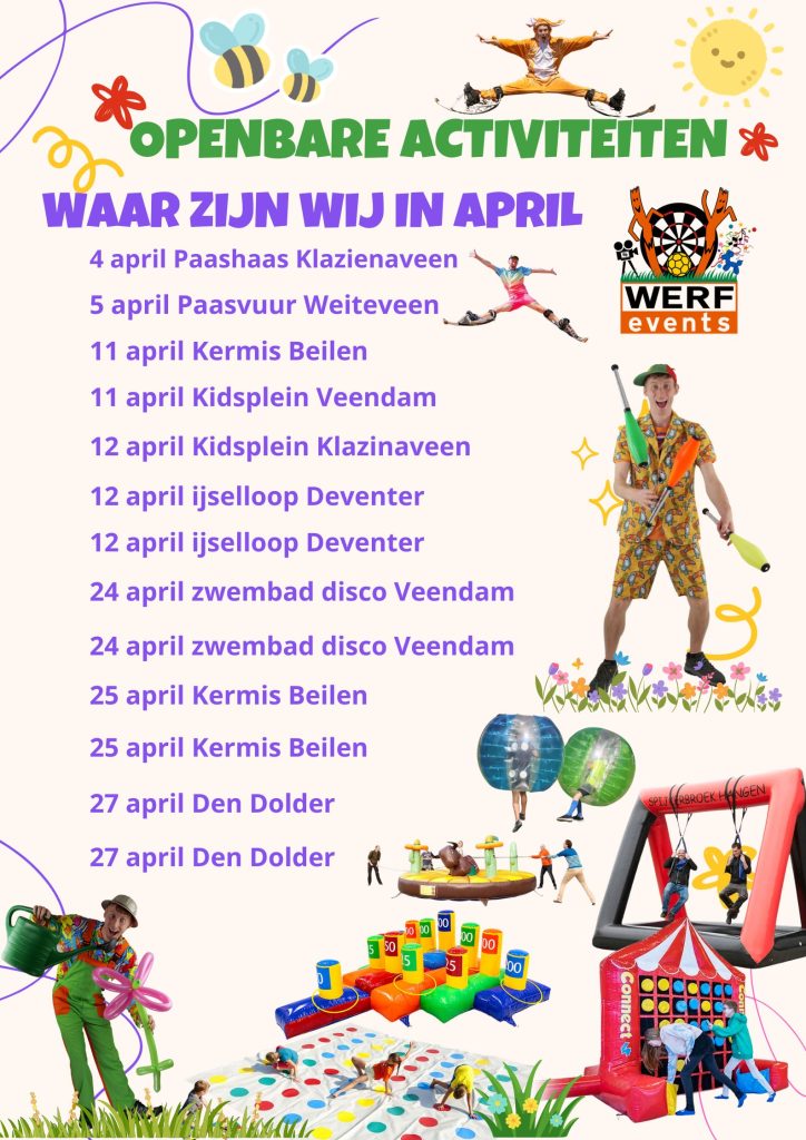 De meeste opdrachten voeren wij intern uit voor organisaties zoals verenigingen, scholen, bedrijven en andere instanties. Om bezoekers toch op de hoogte te houden van onze openbare opdrachten, hebben wij een overzicht samengesteld met de data waarop wij aanwezig zijn.